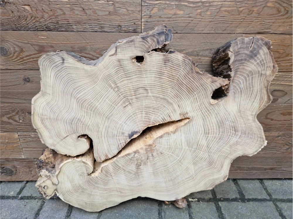 Atypické dřevo akát v nepravidelném originálním tvaru, rozměr je 76-55cm, tloušťka 8cm. Koláč je vysušený, obě strany jsou srovnané frézou a nahrubo obroušené, hrany obroušené nejsou. Ideální na výrobu stolku, vylití epoxidovou pryskyřicí, budete mít originální stolek, který nikdo nemá. Po opracování by tento kus atypického dřeva byl také pěkný jako dekorace, např. na zdi.